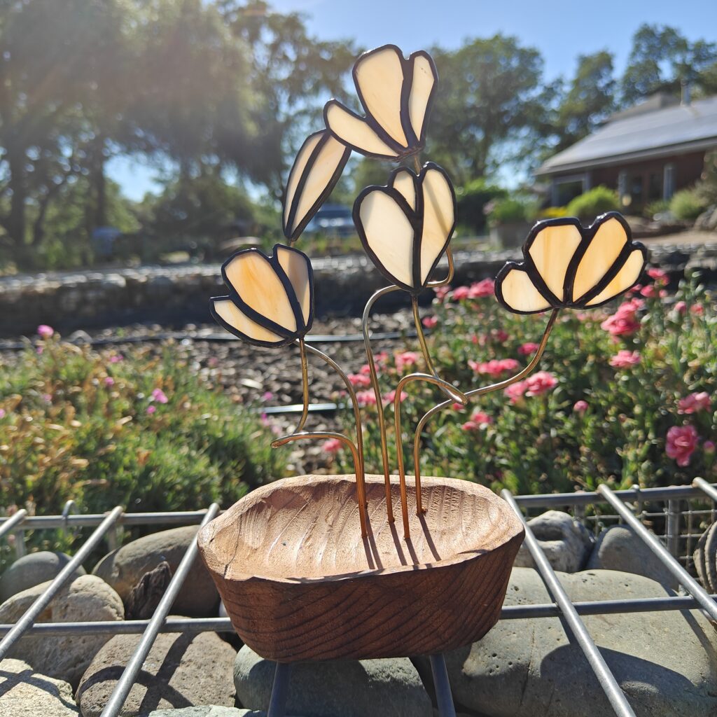 I will have stained glass flower bowls made from vintage glass and hand carved pine bowls. Great for a timeless floral display or for storing small keepsakes.